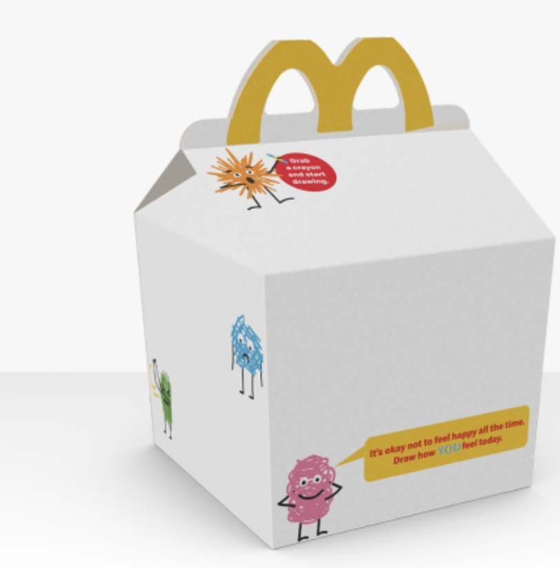 • 通常来说,没有什么比麦当劳的开心乐园餐包装盒更具品牌辨识度了。但在爱尔兰和英国,这家快餐巨头在一段时间内推出了几乎全空白的包装盒。“画出你的感受”开心乐园餐鼓励孩子们将自己的情绪和想法画出来。这一举措是与英国广播公司(BBC)旗下的“救助儿童会”(Children in Need)合作的一部分,该组织致力于帮助家庭探讨心理健康问题。